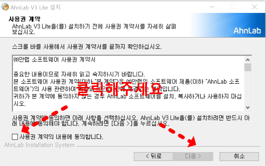 5. 무료로 사용되는 프로그램이니 사용권계약을 클릭해주시고 다음을 눌러주세요